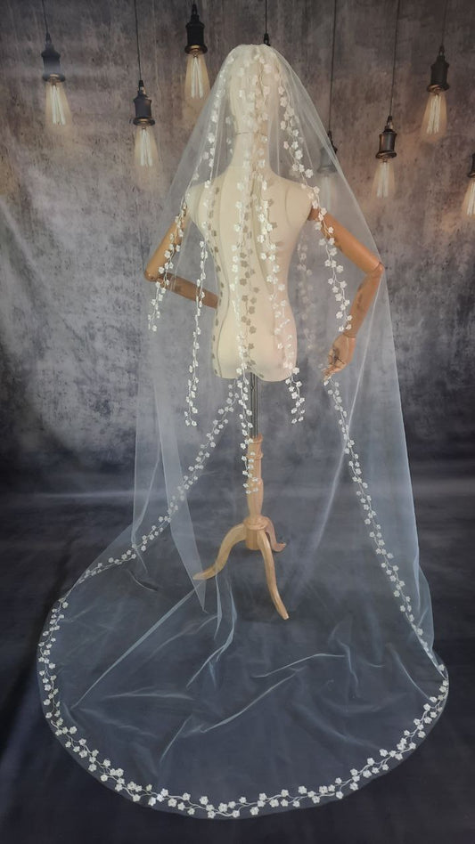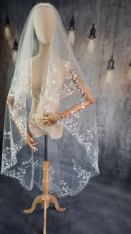 Embroidery floral veil, long flowered veil, cathedral veil, bridal veil, flower lace veil, bohemian wedding veil, beaded floral lace veil