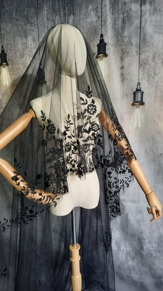 Elegant Black Veil with Exquisite Embroidered Flowers - Stunning Train and One Tier Design