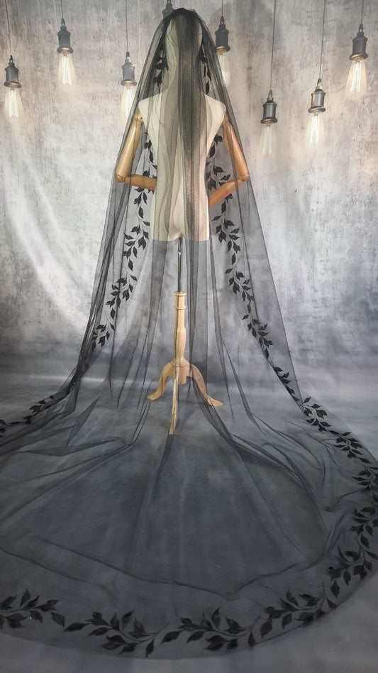 One Tier Black Veil with Beautifully Embroidered Leaf Design