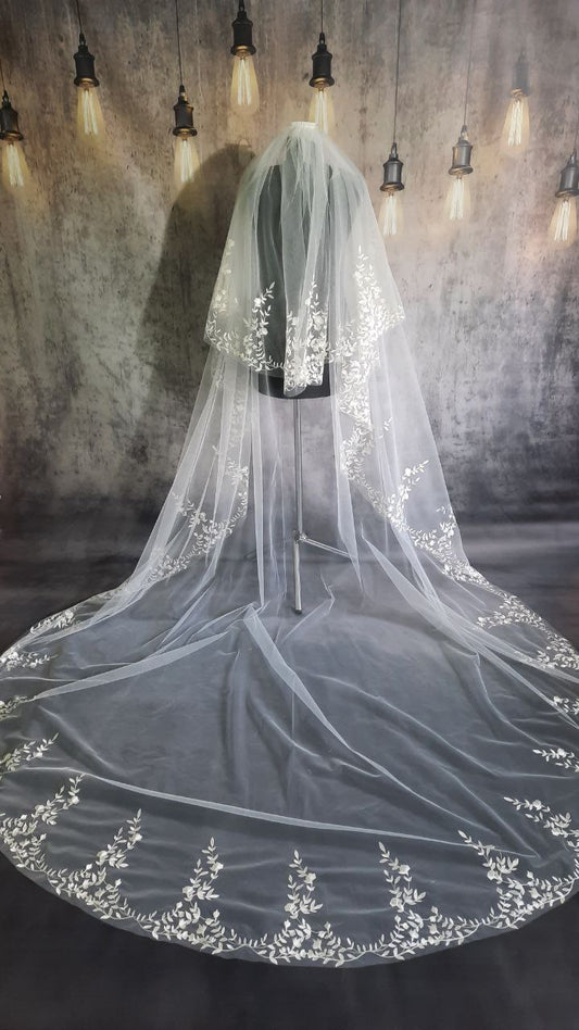 Embroidery floral veil, long flowered veil, cathedral veil, bridal veil, flower lace veil, bohemian wedding veil, beaded floral lace veil